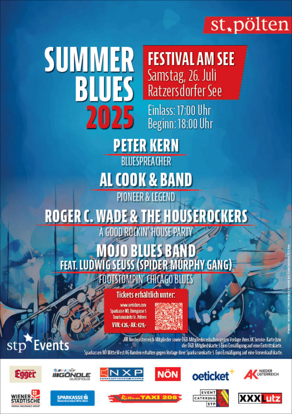 Party on with the Blues !  Wenn nichts passiert, so muß man die Dinge selbst in die Hand nehmen.  Der Musiker Charlie Furthner lädt  gemeinsam mit der Mojo Blues Band 2004 erstmals zum musikalischen Stelldichein nach St. Pölten ins Hammerparkstüberl und was anfangs noch als Pilotprojekt im eher intimeren Rahmen begann, hat sich mittlerweile zu einem der renommiertesten Bluesfestivals Österreichs gemausert. Rund 1000 musikbegeisterte Fans pilgern jährlich zum - inzwischen an den Ratzersdorfer See übersiedelten - Summer Blues Festival, um im unvergleichlichen Ambiente mit Bands und Musikern aus dem In- und Ausland den Blues zu zelebrieren. Auch das Organisationsteam ist mittlerweile angewachsen. Gemeinsam mit Charlie Furthner teilt  sich seit 2007 das Veranstaltungsservice St. Pölten (vormals BüroV)  die vielen Aufgaben, die zur erfolgreichen Durchführung eines Festivals dieser Dimension notwendig geworden sind. Das großartige Echo von Presse, Publikum und den Musikern selbst garantieren dem St.Pöltner Summer Blues Festival auch in Zukunft eine wachsende Popularität und wir dürfen uns daher auf noch viele wunderbare Bluesnächte freuen!